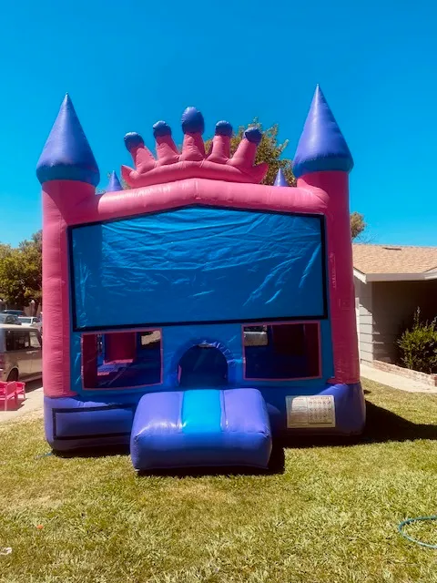 Pink crown princess bounce house is great all parties and events, holds 8-10 kids, and a art panel can be placed on the outside .