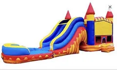 This is a gigantic 40ft combo, made for fast kids and adults. This mega turbo combo features a 12ft drop into a 100 gallons of water. It has basketball hoops and a huge jump area for up to 8-10 kids.