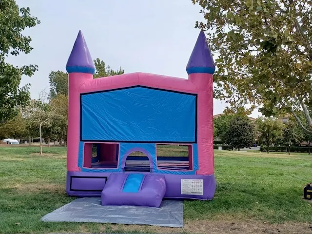 Hot pink and baby blue castle house is great for all parties . This bounce house house has hoops inside and can easily hold 8-10 kids.