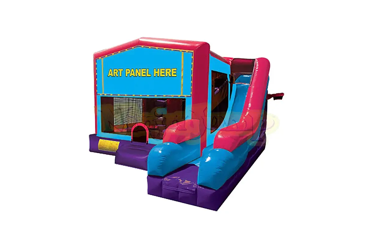 Dream mod 1000 has basketball hoops inside, has turnbuckles to plow through as you make your way up the tall slide. Huge area to jump in