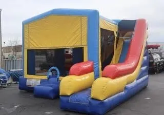 Blue c7 combo mod is a fun big combo bounce house! It can hold 8-10 kids, it comes with a mini obstacle course, basketball hoops, a big jump area and a 19ft slide. Great for all parties and events. You can also put art panels on the outside to create a party theme.