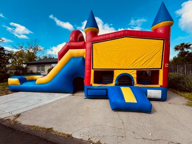 Funhouse 101z has happens inside, and 9ft drop slide, banners can be placed outside. This unit can be used with water and holds 8-10 kids